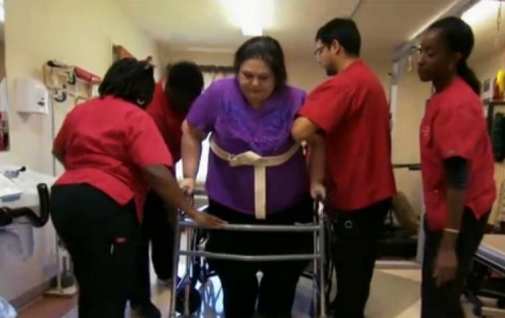 Mayra fazendo fisioterapia para recuperar resistência nas pernas, que não conseguiam sustentar o execesso de peso dela/ Imagem: TLCInspiração para outros
